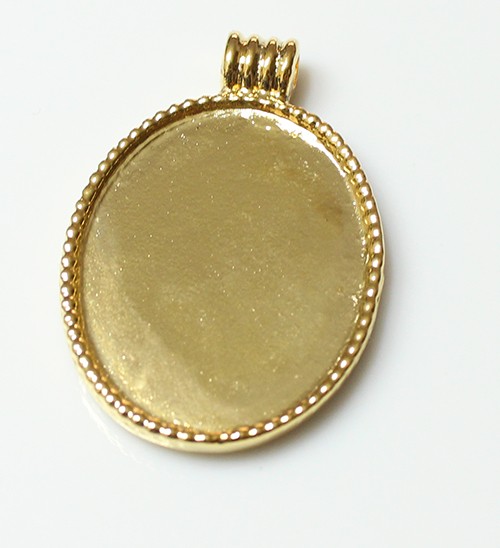 תליון אובל עם מסגרת לעבודה עם חימר או להדבקת אבנים. יש לנקות את התליון לפני עבודה עם החימר. הצבע במוצר זה הינו ציפוי ולכן עלול לדהות. יש לשמור ממגע עם מים, בושם, חומרי ניקוי וכד'.
