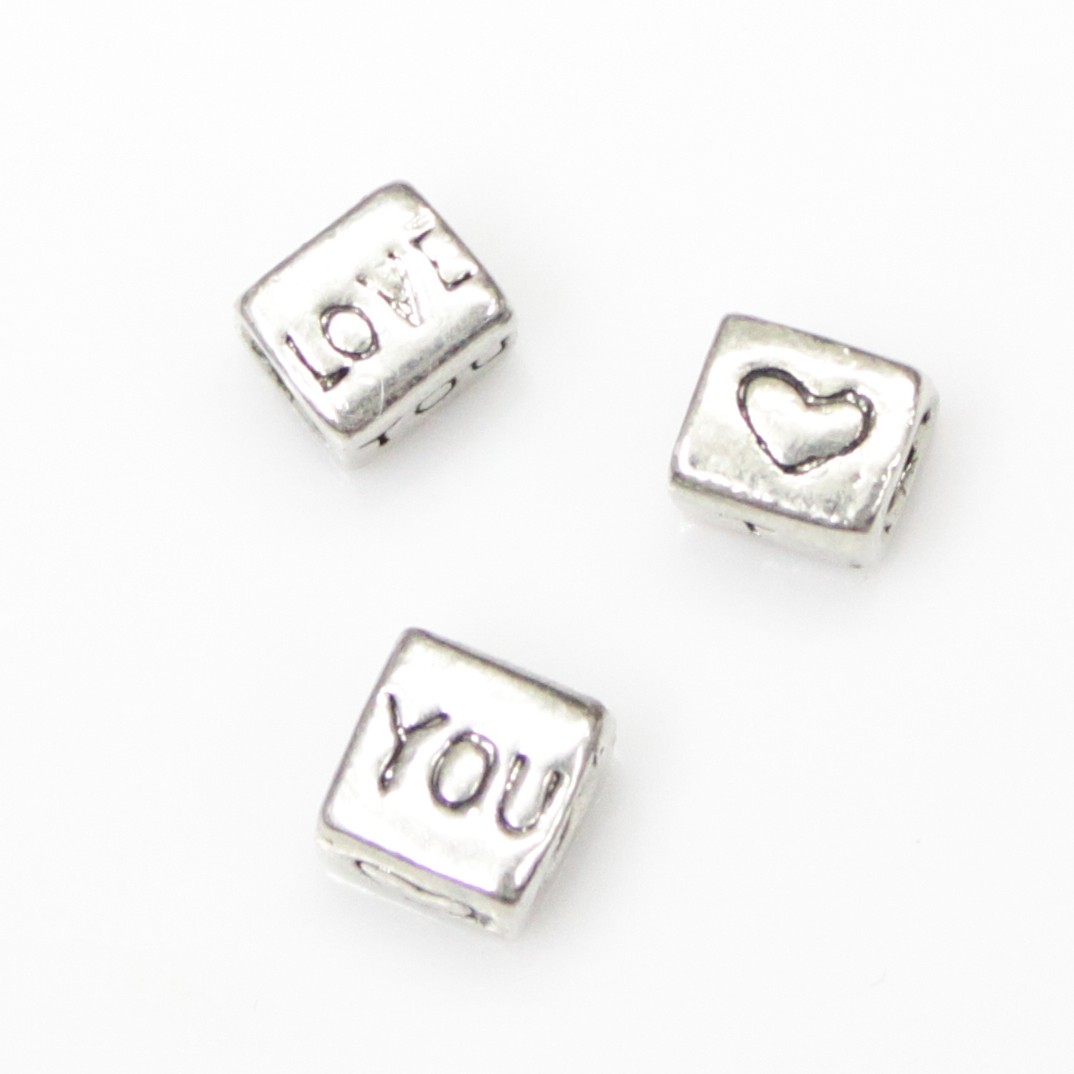 - חרוז מתכת - קוביה עם לב+love